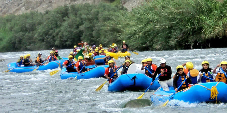Continuando nuestro recorrido llegamos a Lunahuana e Iniciamos nuestro recorrido con un City tour visitando la Plaza de Armas donde conoceremos la historia e etimología de la ciudad… enseguida nos dirigiremos a la casa embrujada, a una bodega vitivinícola donde haremos un recorrido por las instalaciones y aprenderemos la elaboración de vinos y piscos…. Seguimos nuestro recorrido y conoceremos un centro apícola para conocer cómo se producen la miel de abeja y derivados. Luego iremos río arriba hasta el embarcadero, donde nos entregan nuestros equipos de navegación y seguridad (casco, chalecos salvavidas y remos). Antes de ingresar al rio recibiremos una charla para saber cómo remar y cómo conducirnos en el río (20 minutos). Una vez adiestrados, comienza la aventura, la adrenalina empieza a fluir y el río nos hace volver a nacer en cada rápido y en cada torrentera donde se sumerge y sale la balsa. Es inevitable dejar de remar con fuerza y observar como todos gritan de emoción tras pasar cada obstáculo. Nuestro Guía indica: ¡Hacia adelante!, ¡hacia atrás!, ¡alto!, ¡izquierda atrás!, ¡derecha atrás!, ¡todos adentro! Hasta que su voz se confunde con el arrullo de las olas del Rio, Tratamos de cumplir las órdenes y vivir una emocionante aventura que nunca olvidaremos. Los que no deseen realizar el canotaje podrán disfrutar del río o visitar el mirador.